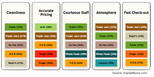 ...though one has to wonder about that "Fast Check-out" ranking! They must have limited their survey to shoppers who buy groceries before noon on Mondays and Tuesdays. But seriously, folks; as I note in my book, a cheerful checkout clerk undoes the frustration of those long checkout lines. That's what this survey reflects.